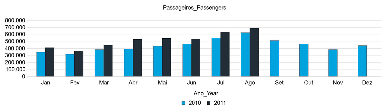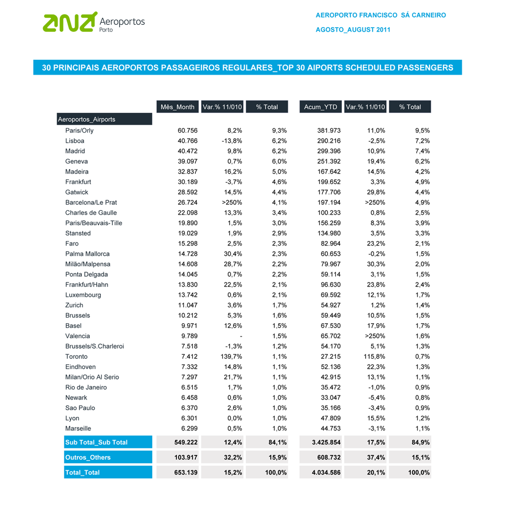 Tradicionalmente o mês mais movimentado do ano, Agosto voltou a não desapontar com apresentando 683.926 passageiros (+61.737 /9,9%), número que estabelece um novo recorde mensal no nosso Aeroporto. No total de 2011, 4.129.728 passageiros (+638.894 / 18,3%) utilizaram o AFSC. No entanto, e olhando para as taxas de crescimento que temos visto desde o inicio deste ano, verificamos que o valor atingido desta vez é um pouco mais baixo, algo que se deve muito simplesmente à queda a pique do tráfego charter, que perdeu uns impressionantes 44,3% / 24.429 passageiros! É uma queda já esperada atendendo não só às sucessivas declarações dos agentes turísticos, mas também ao ambiente cada vez mais austero que se sente no país e que se reflecte neste tipo de tráfego. Foi também esta a razão que impediu bater a barreira dos 700.000 passageiros mensais.