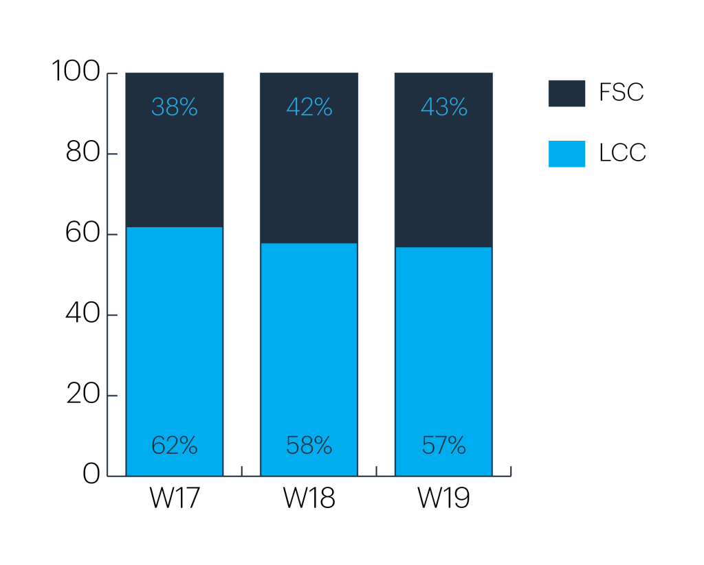 Já a distribuição LCC-FSC continua a trajectória de equilíbrio, com as companhias low-cost (LCC) a representarem 57% dos lugares disponíveis, contra 43% das companhias tradicionais (FSC). A tendência continua a vir da mão de aumentos de oferta mais elevados por parte das tradicionais, embora as de baixo custo também estejam a crescer.