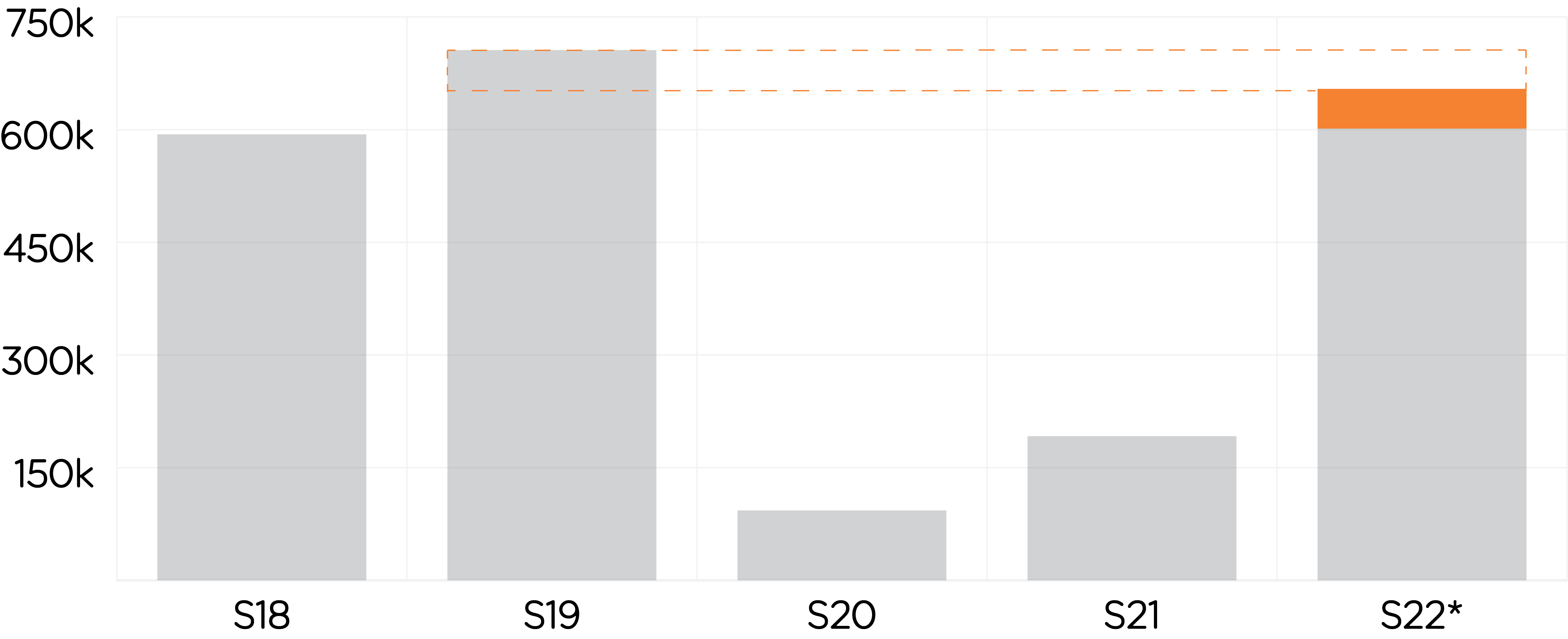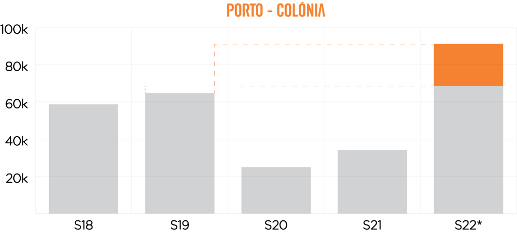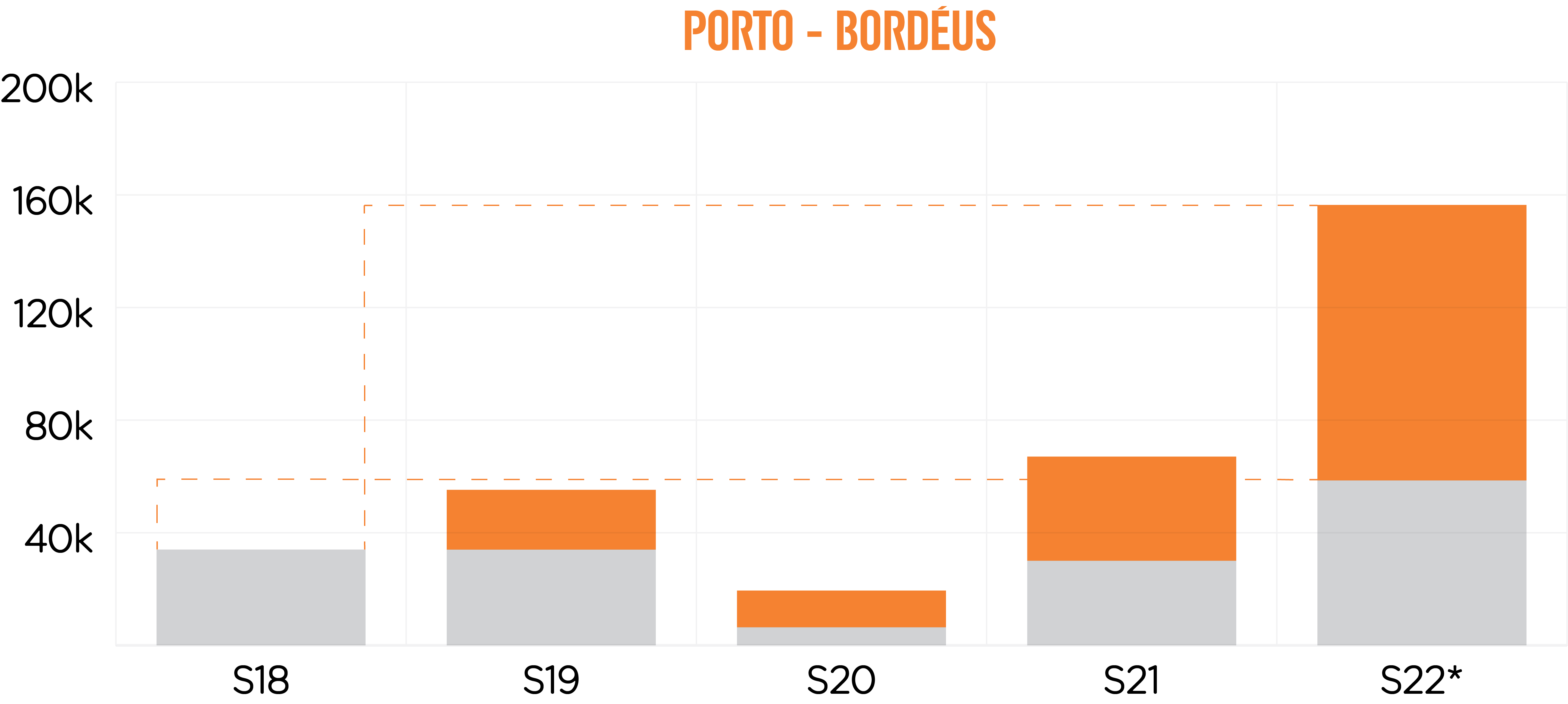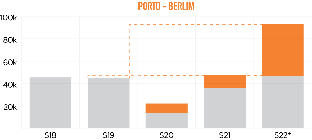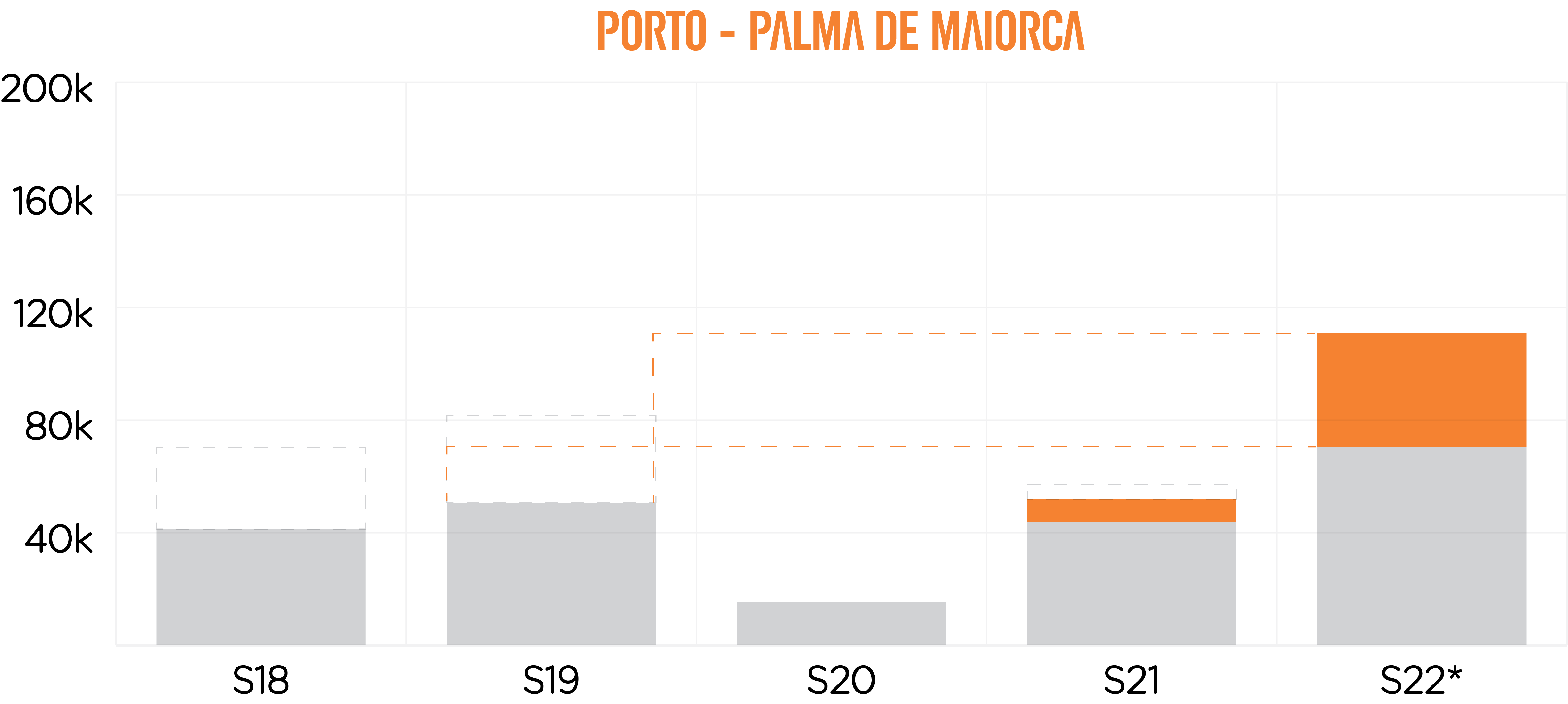 Evolução do nº de lugares e ocupações médias entre o Porto e Colónia, Berlim, Bordéus e Palma de Maiorca. Valores S22 são estimativas. Lugares programados pela easyJet a laranja, pela Ryanair a cinzento e de companhias charter a tracejado. Dados: aerOPOrto