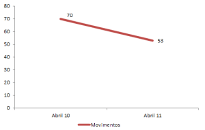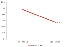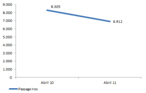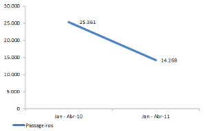 Comparando o primeiro quadrimestre deste ano com o de 2010, os dados são claros: houve uma clara diminuição dos movimentos e consequentemente, uma queda proporcional dos passageiros, tendo a ocupação mensal aumentado significativamente, ainda que a ocupação anual continue em níveis baixos.